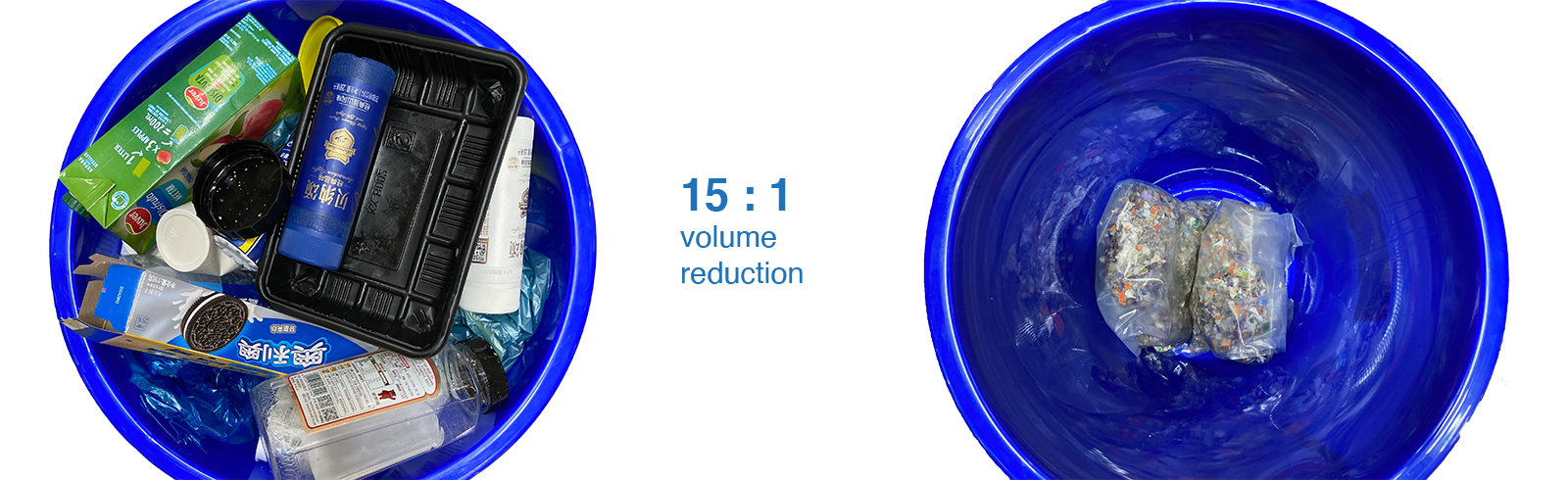 The crushmaster marine CM-ONE allows for a reduction of common waste to a factor of about 1:15. Reducing the contents of a 60l trash can down to just 4l of volume.